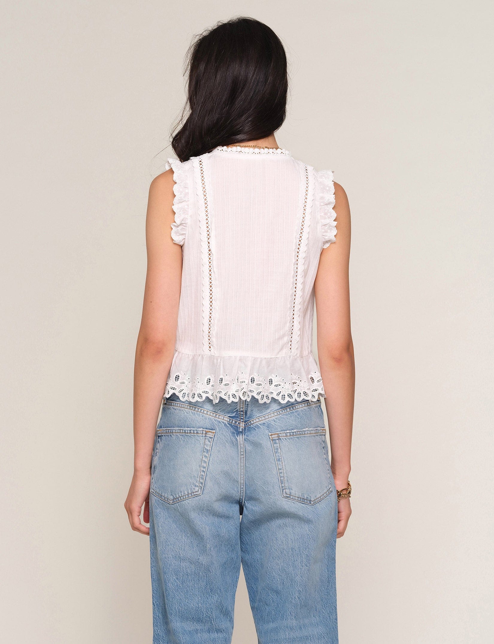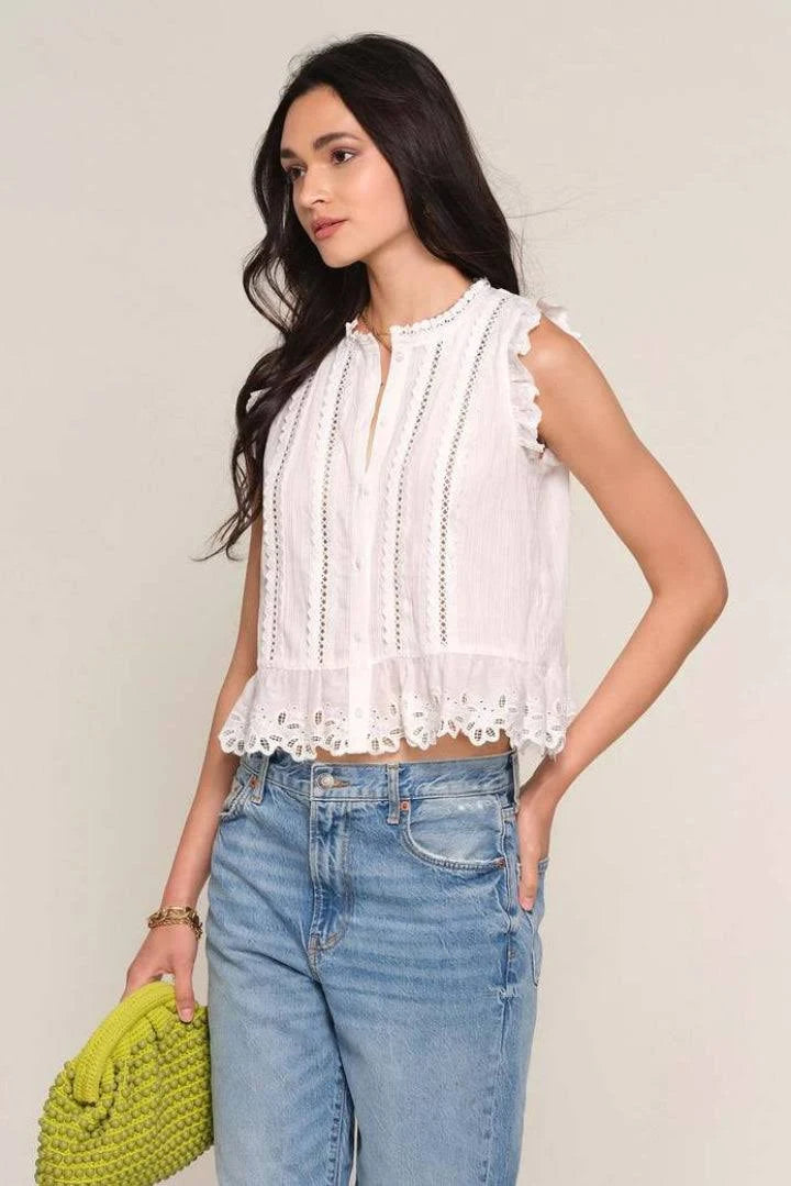 This is the kind of top that instantly makes an outfit feel put-together without trying. The Dia top has delicate lace detailing, soft ruffle trim, and airy cotton fabric that gives it that effortless French-girl charm we’re always chasing.