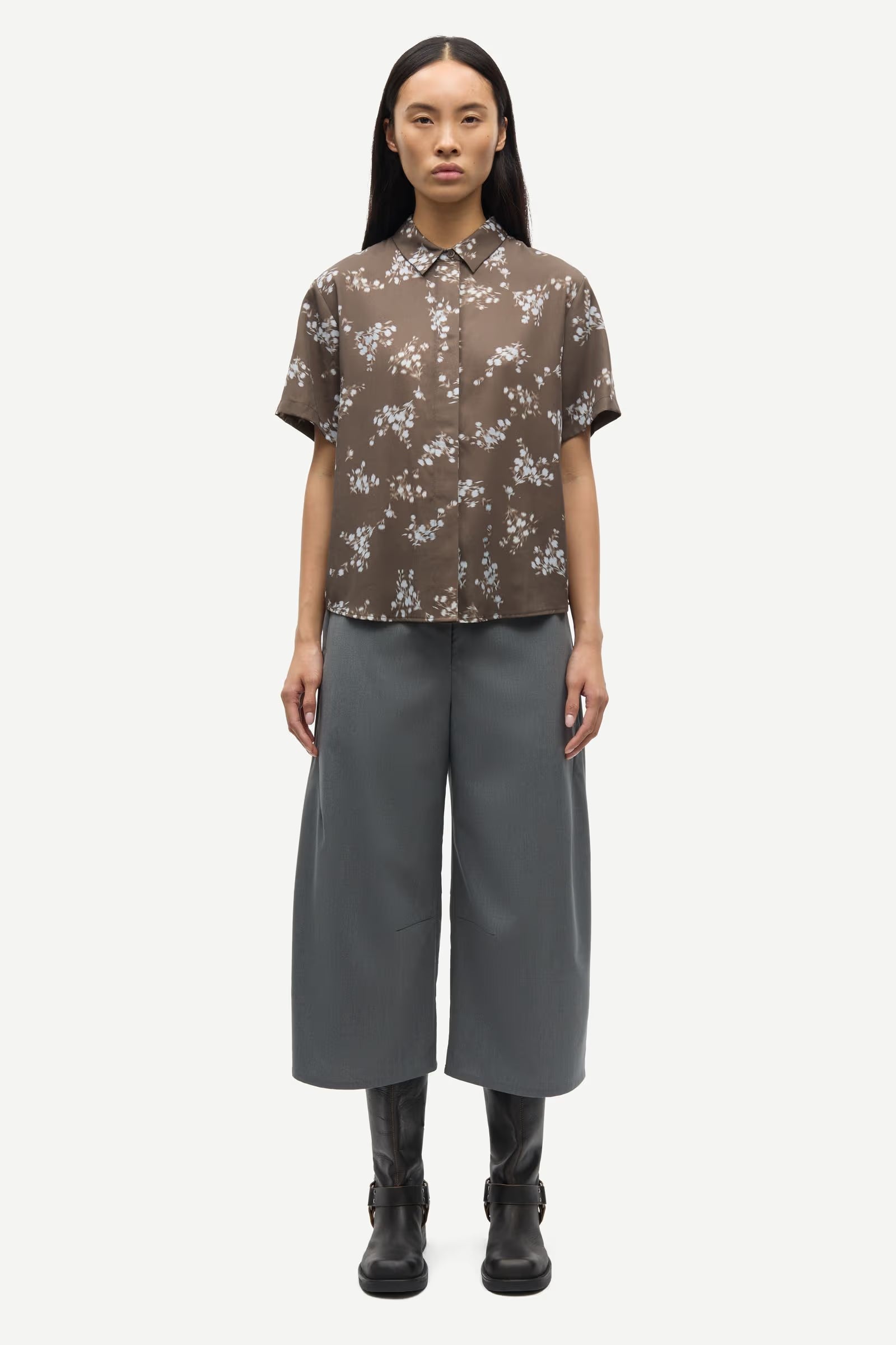 A refined take on a classic short-sleeve shirt, designed with clean lines and an effortless drape. The minimal silhouette and hidden button placket give it a polished, modern feel.