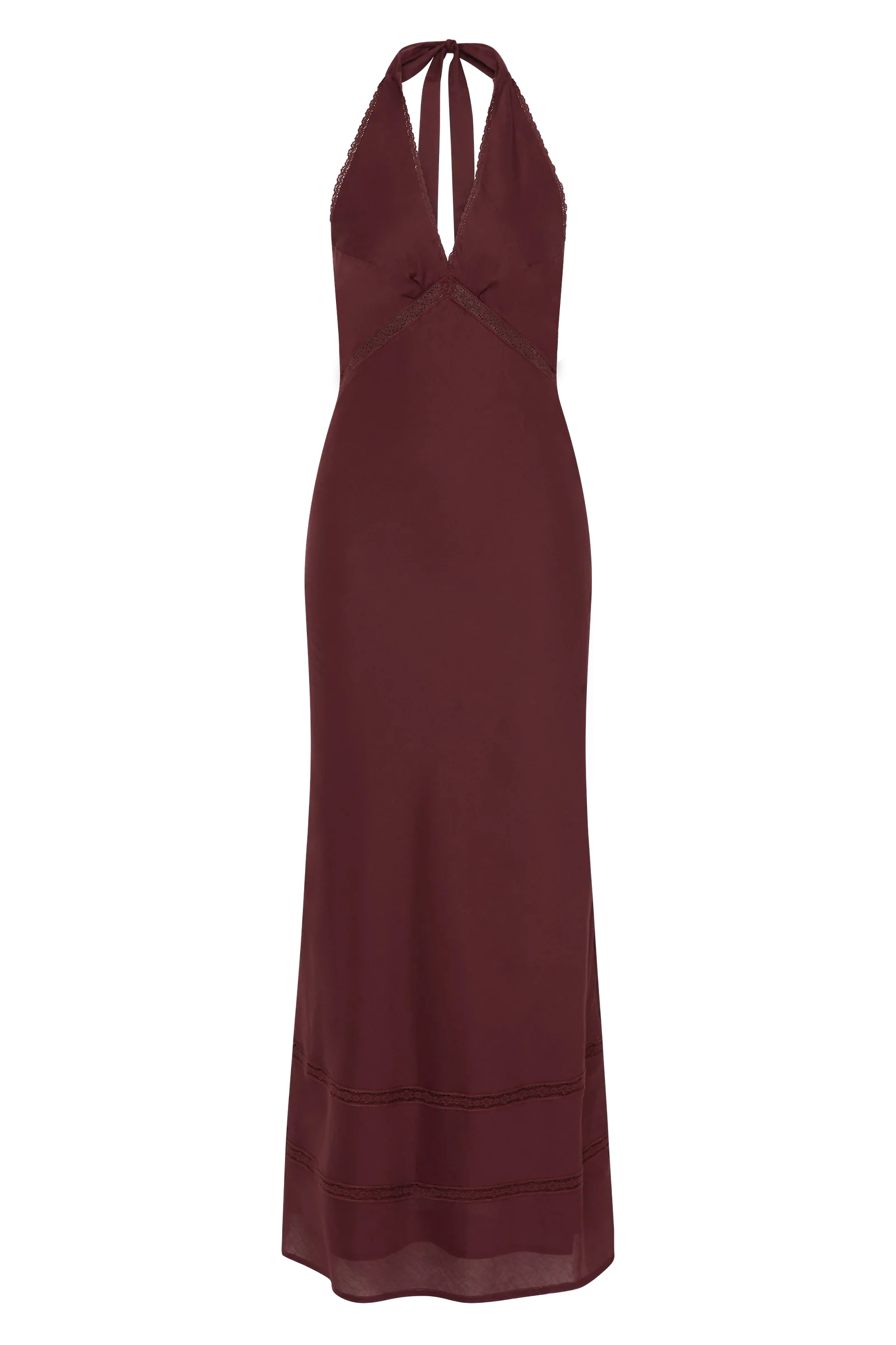 A halter-style maxi dress with back neck ties and vintage-inspired lace trim around the neckline and under the bust. Backless and semi-fitted through the upper body, it then falls into a soft A-line skirt with further vintage-inspired lace detailing through the skirt in two tiers. Designed in a 100% cotton voile fabrication in a deep bordeaux shade, style with a simple heel for day to night dressing.