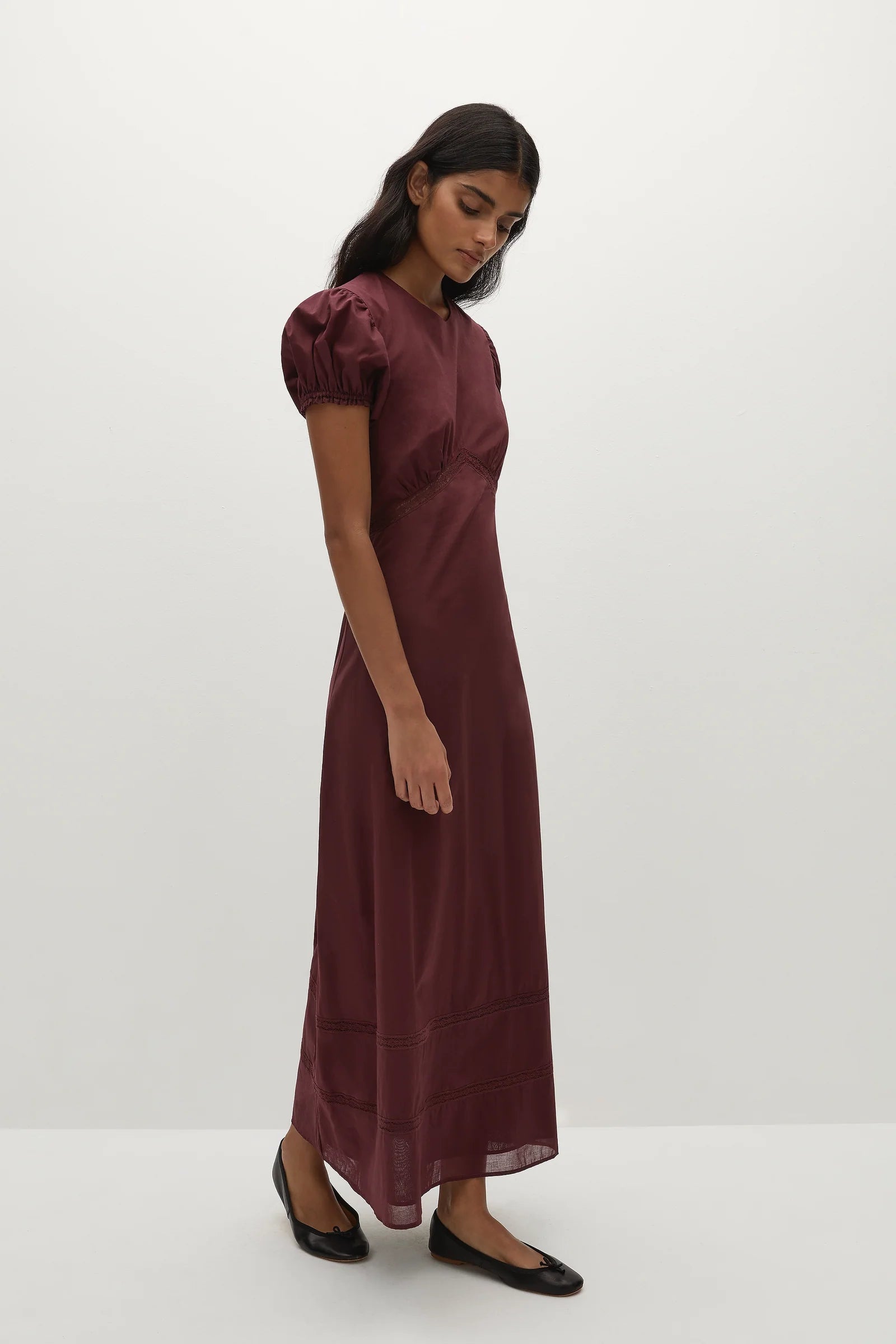 A feminine midi dress with high round neckline and short puff sleeves, elasticated at the cuff with a frill detail. The bust is slightly gathered with an empire seam and delicate vintage-inspired lace detailing, also featured in two tiers around the bottom of the skirt. Softly fitted through the upper body with a back waist tie, it then falls into an A-line skirt, cropping around the ankles. Style with a simple ballet flat for transeasonal dressing.