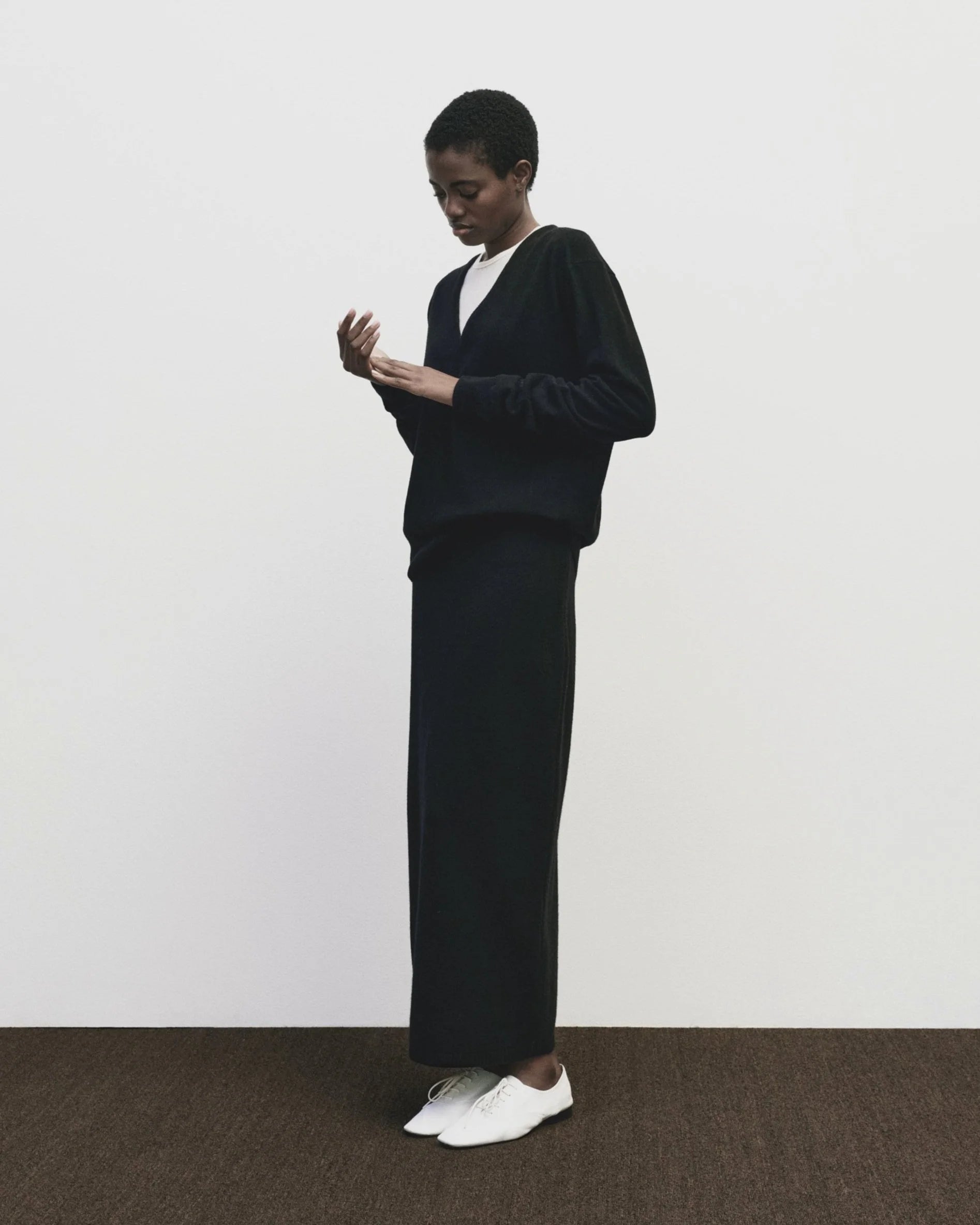 This skirt is crafted from a mid-weight merino wool and cashmere blend knit for a soft yet structured feel. Designed with a regular straight fit, it falls to a maxi length and features an elasticated waist, back slit, and slip-on style. Unlined for natural drape and comfort.