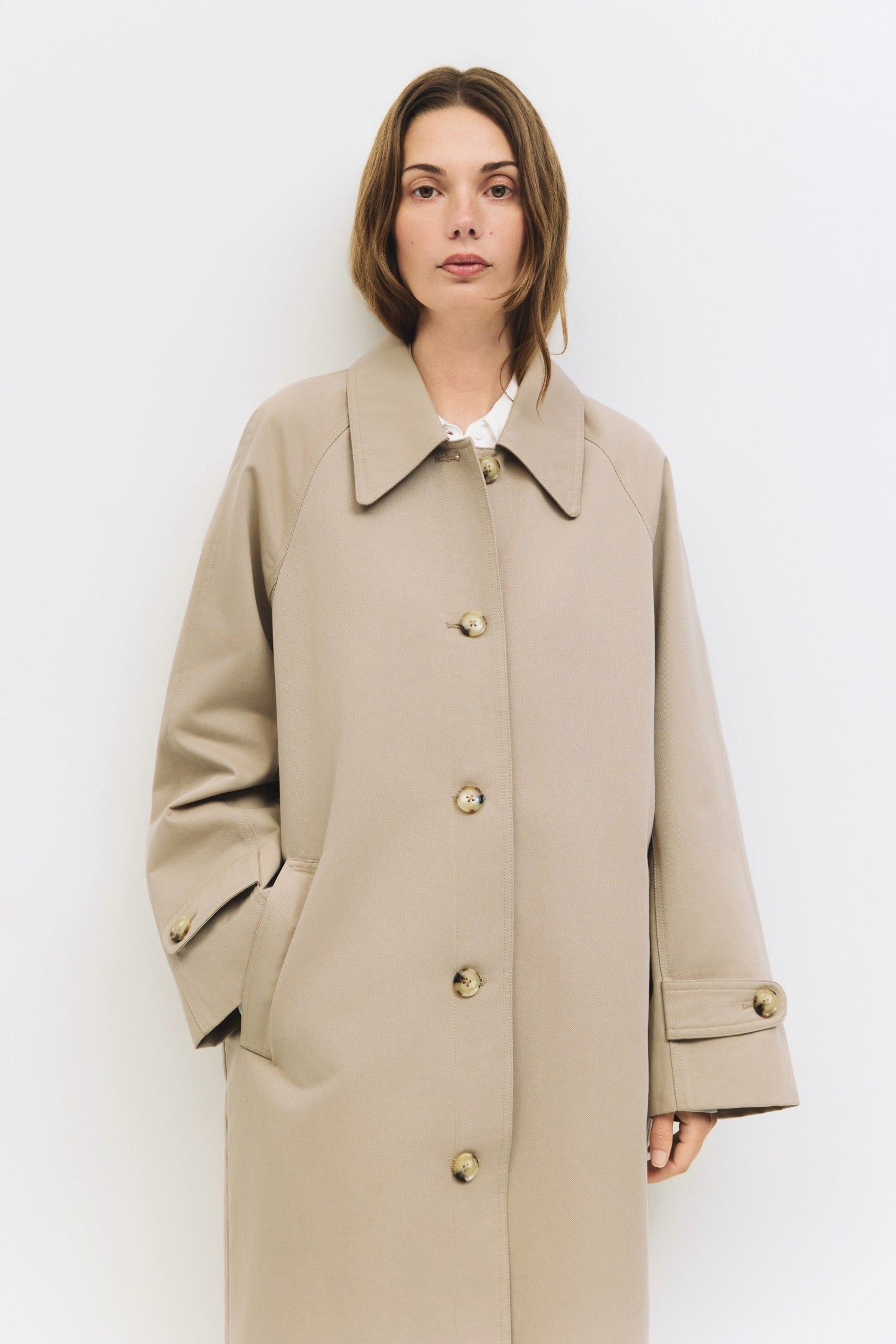 The Serena Coat blends timeless tailoring with contemporary ease, featuring a pointed collar and raglan sleeves for a relaxed yet refined silhouette. Finished with adjustable cuffs, welt pockets, and a back slit, this midi-length trench coat is designed for effortless layering.
