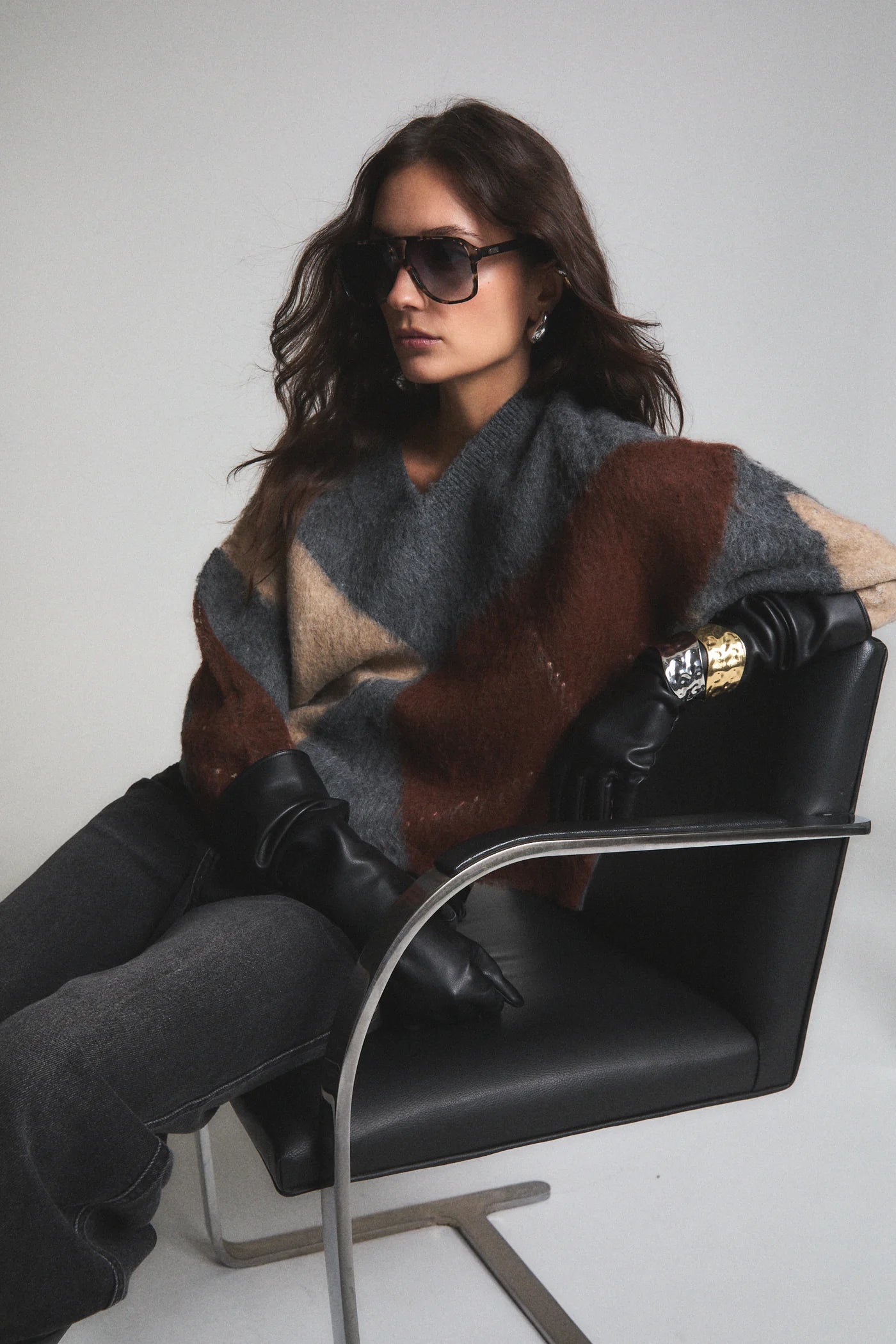 A refined take on cozy layering. This soft knit sweater features a relaxed silhouette with an artful color-blocked design in warm brown, neutral beige, and soft grey tones. Designed with a draped neckline and effortless fit, it offers understated elegance while remaining incredibly comfortable. The plush texture and modern palette make it perfect for both everyday wear and elevated off-duty styling.