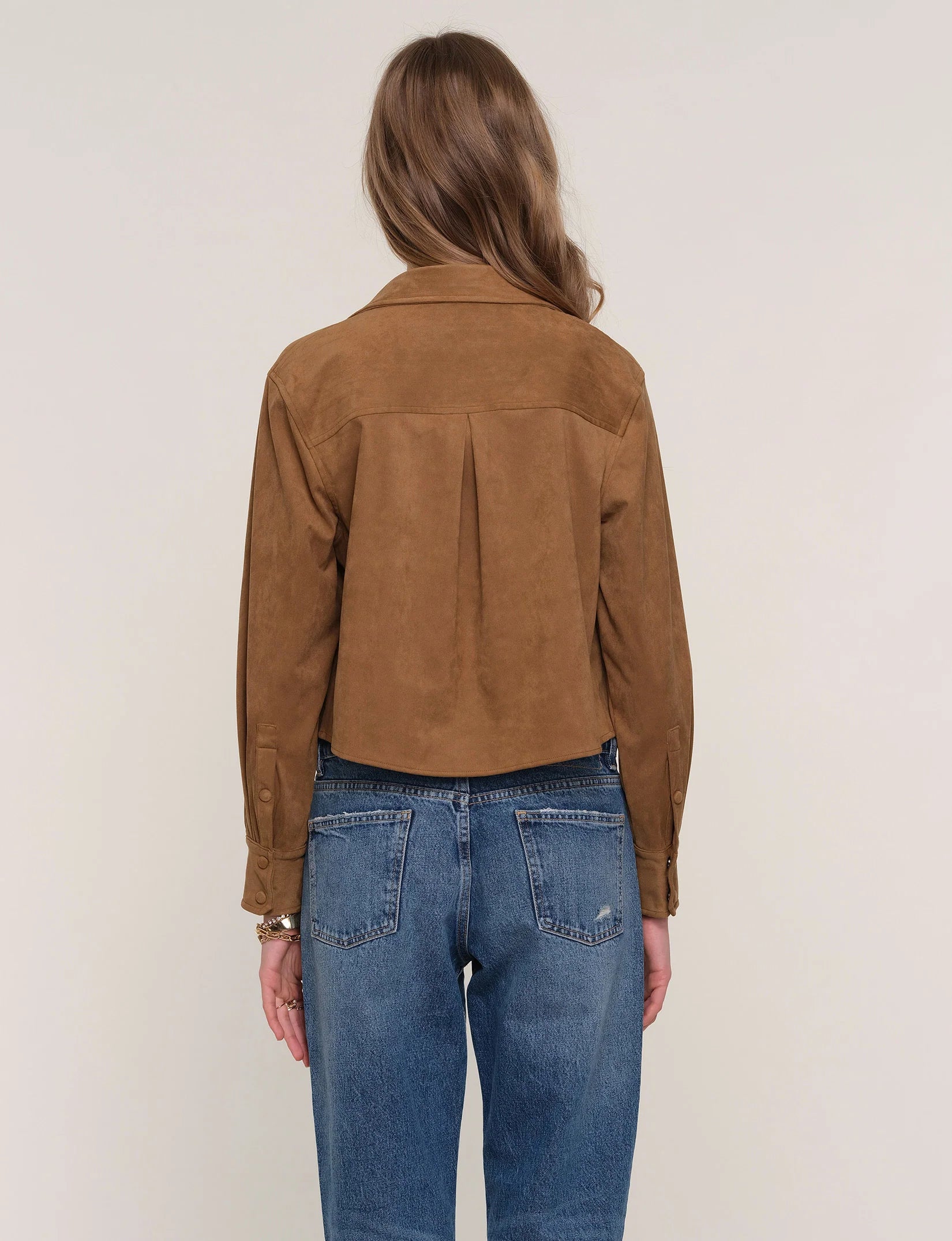 The Castalia Top is a classic, cropped, button down shirt. It has a relaxed fit and is made from a super soft, faux suede. Wear it open over a tank or closed with a pair of high waist jeans.