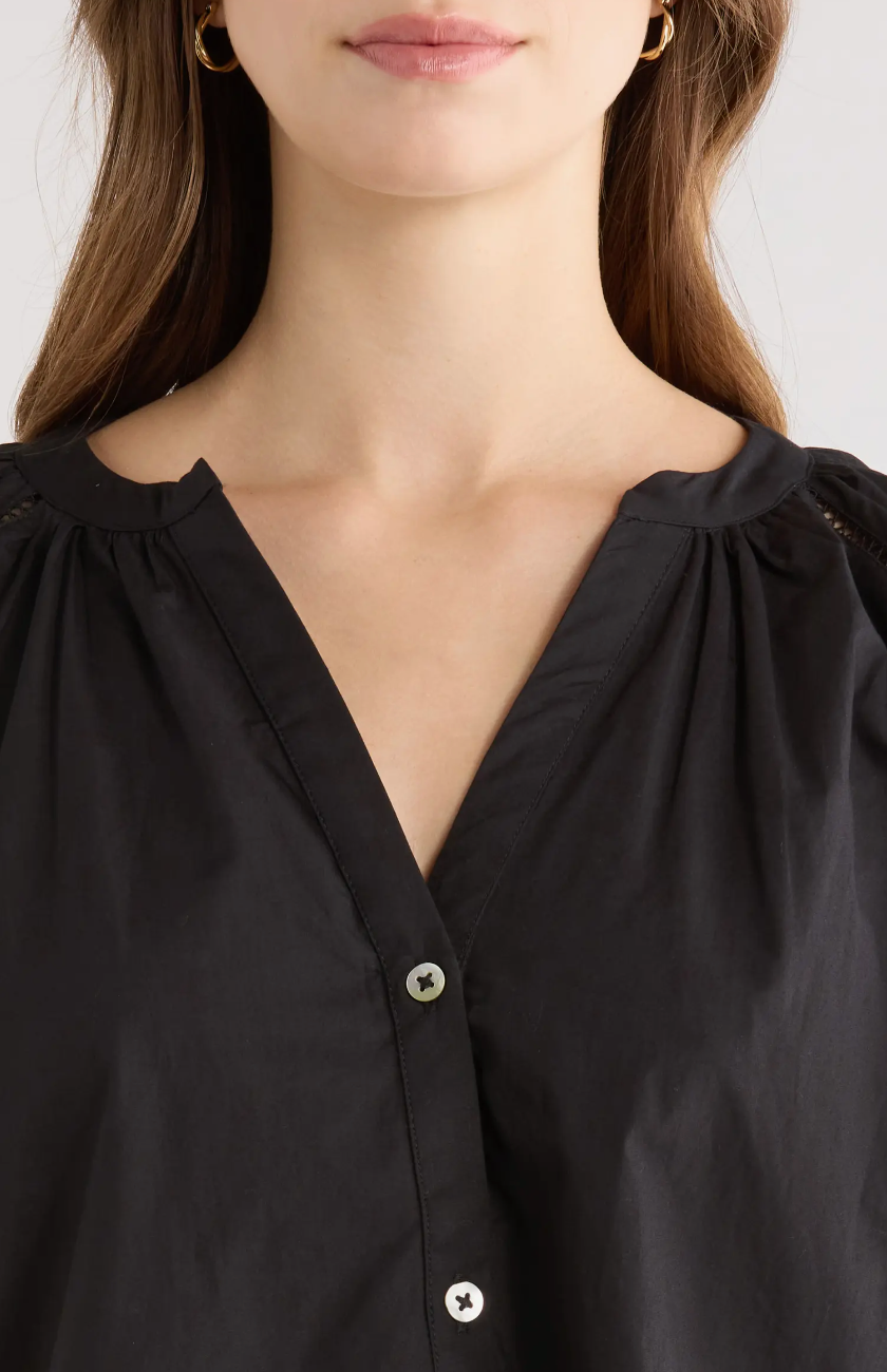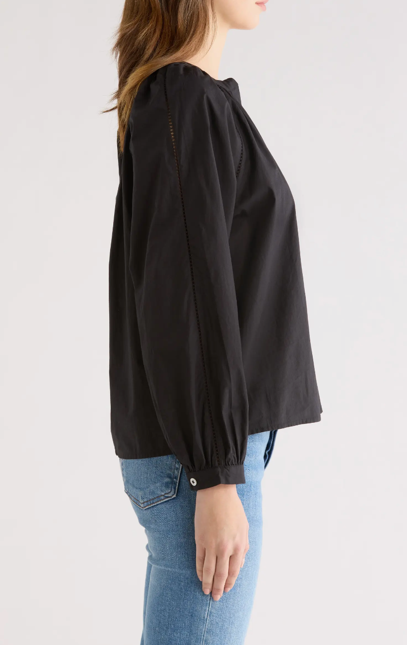 This effortless black blouse is a timeless wardrobe staple with subtle feminine detailing. Designed with a soft split neckline and gentle gathers at the shoulders, it drapes beautifully for a relaxed yet polished look. The lightweight fabric gives it an airy feel, while the long sleeves finish with softly cinched cuffs for added shape. Finished with a clean button-front and an easy, slightly boxy silhouette, it’s perfect for tucking into denim or wearing loose over tailored trousers—an elevated everyday piece you’ll reach for again and again.