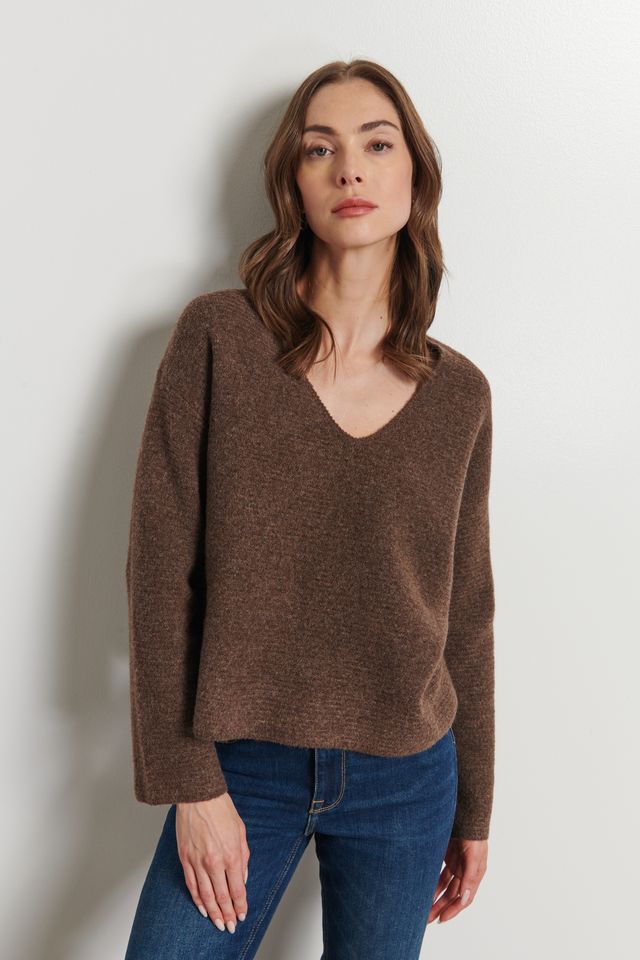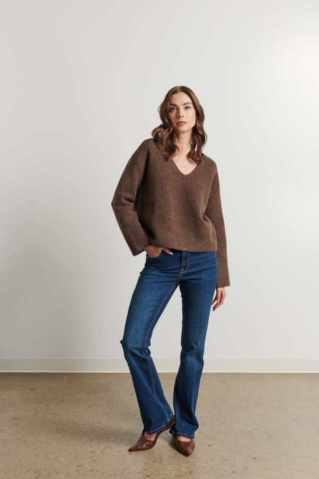 This brown sweater is crafted in a soft knit with a clean, minimalist silhouette. Featuring a flattering V-neckline, long sleeves, and a relaxed fit, it offers effortless versatility-perfect for layering or wearing on its own with denim or tailored pieces.