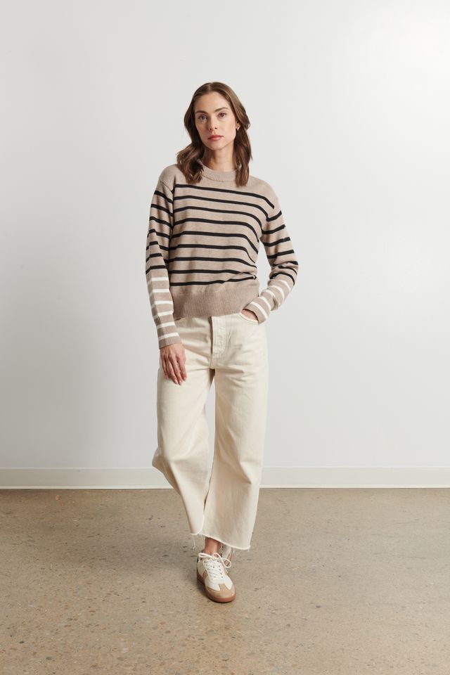 This striped sweater is crafted in a soft knit with a timeless beige base and contrasting black stripes across the body. It features a classic crew neckline, ribbed hem and cuffs, and playful contrast striping on the sleeves for a modern twist. A versatile everyday piece that pairs effortlessly with denim or tailored separates.