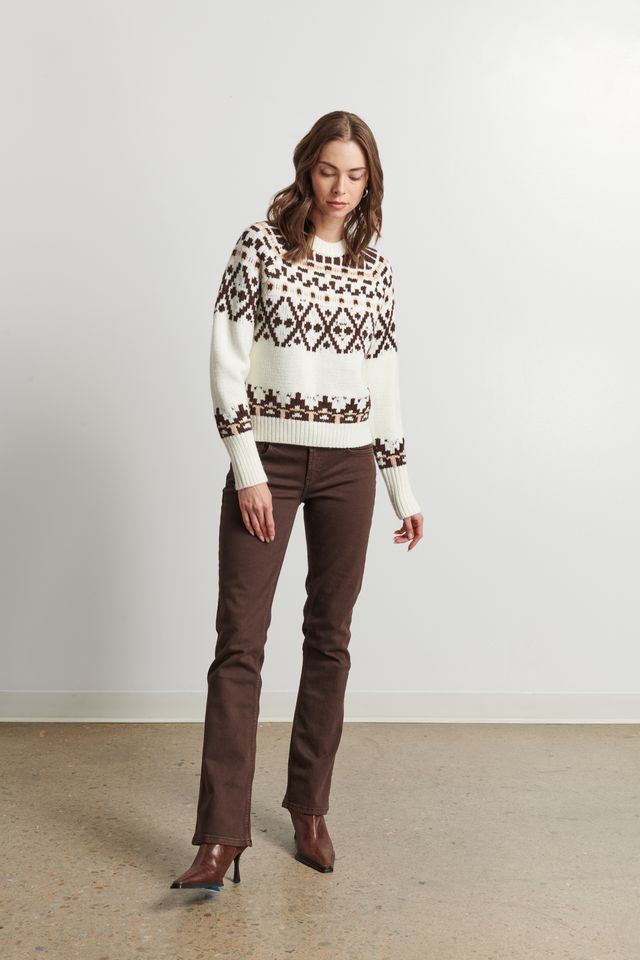 This sweater features a classic Fair Isle-inspired pattern in rich brown tones against a cream base. Designed with a crew neckline, long sleeves, and ribbed trims, it blends cozy warmth with timeless style. Perfect for layering, it pairs effortlessly with denim or tailored trousers for a winter-ready look.