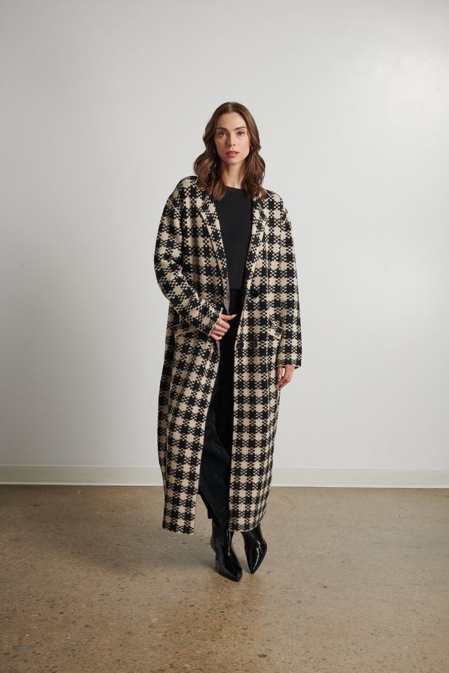 A statement in timeless tailoring, this full-length coat features a bold houndstooth pattern in warm neutral tones. The straight, relaxed silhouette is balanced by structured shoulders and a clean notched collar, giving it a modern yet classic appeal. Crafted from a thick, textured wool blend, it offers both warmth and sophistication for the season ahead. Finished with deep front pockets and a single-breasted closure, it’s designed for layering effortlessly over knits or tailoring alike.