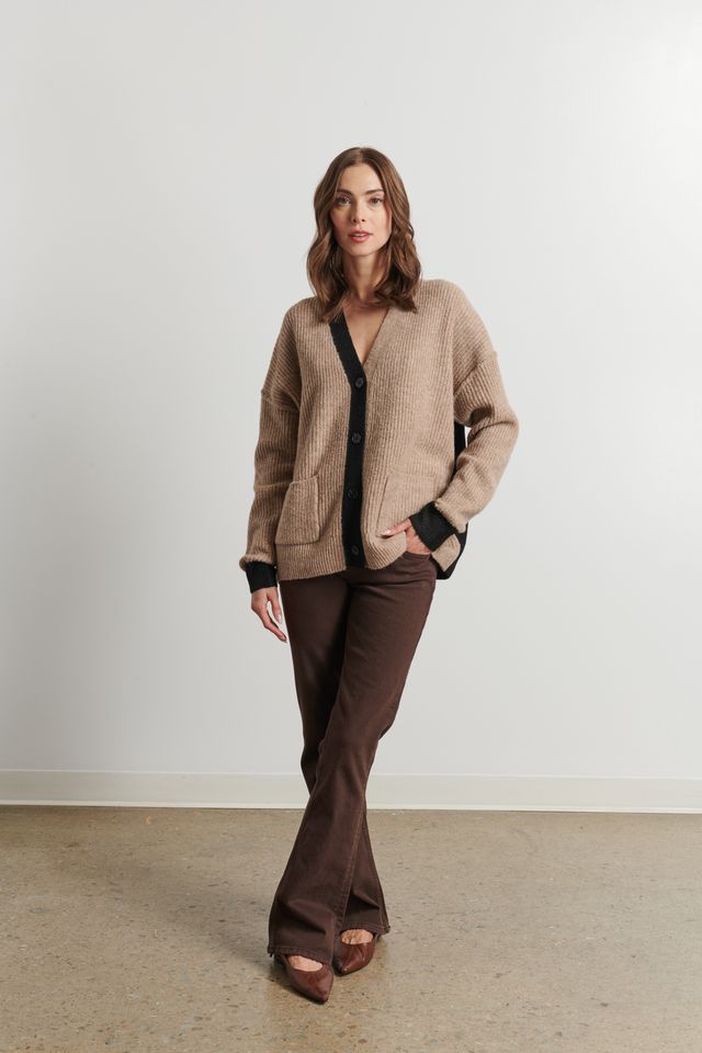 This cardigan is crafted from a soft ribbed knit in a warm beige tone with contrasting black trim for a modern finish. Designed with a relaxed fit, it features a deep V-neckline, front button closure, and two patch pockets. Easy to layer, it brings a laid-back yet polished touch to everyday styling.