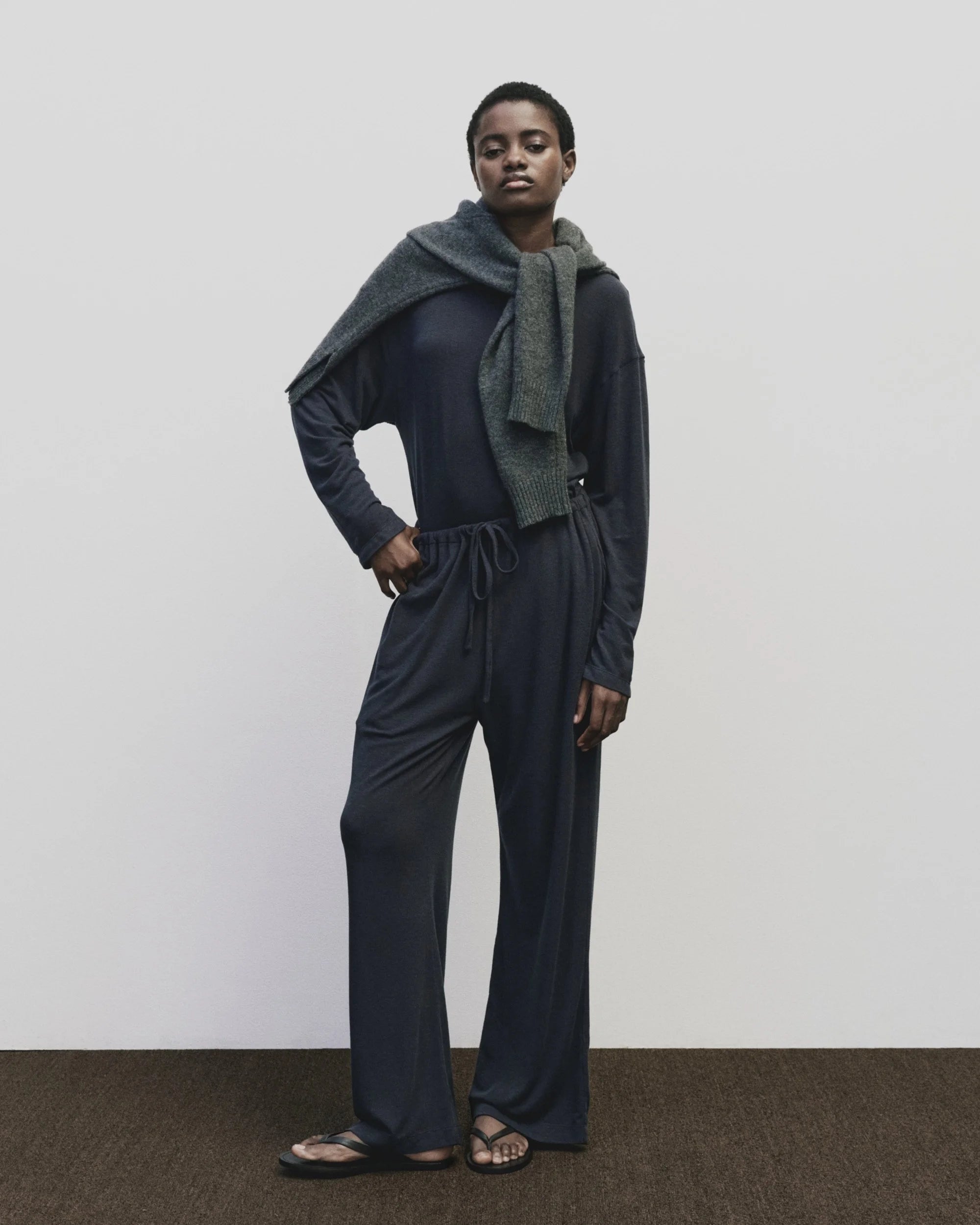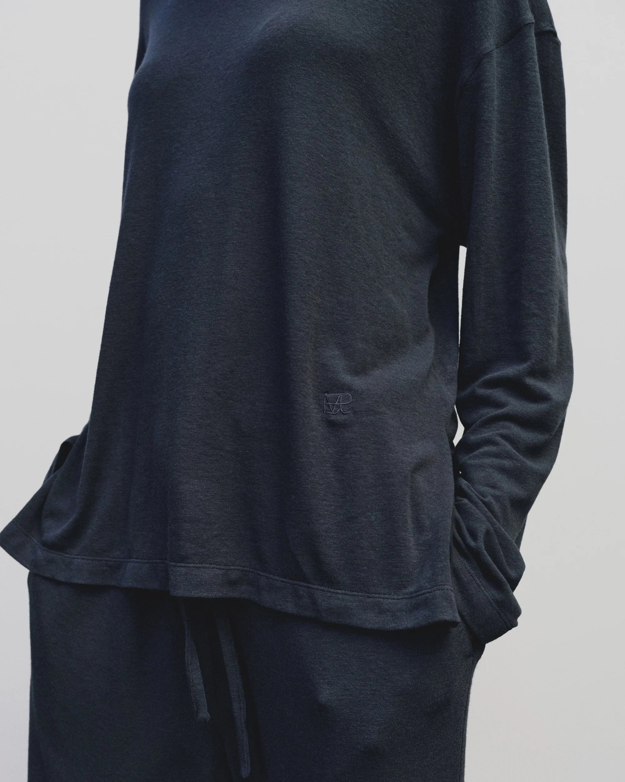 This lightweight wool-cotton blend top is designed with an oversized fit for relaxed comfort. It features a classic crew neckline, drop shoulders, and long sleeves, finished with side slits for ease of movement. A slip-on style makes it an effortless everyday piece. Pair with the Wool Cotton Jersey Pant for a complete matching set.