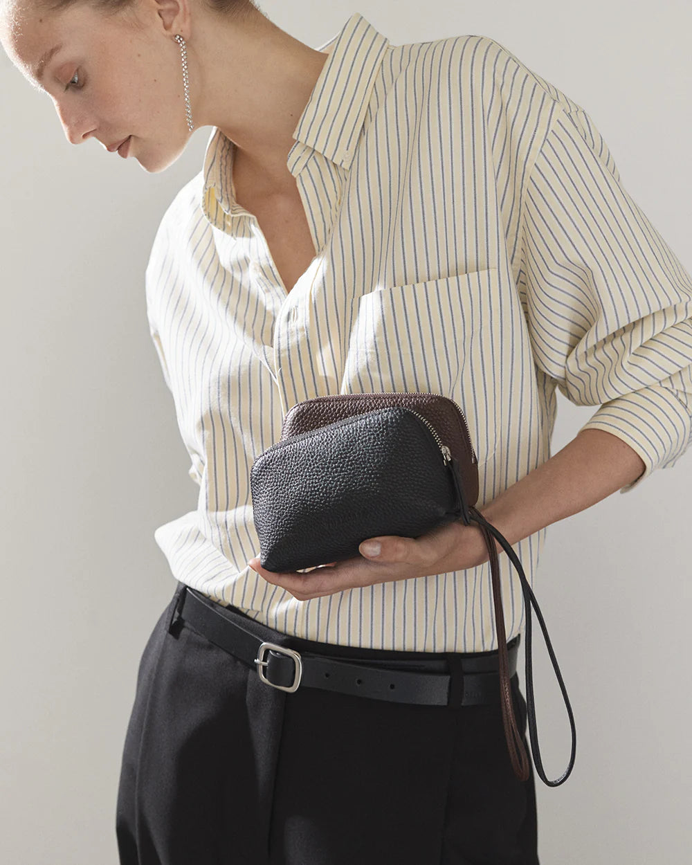 Gently curved wristlet pouch in grained leather with thin leather loop and top zipper closure. It's compact shape will hold a essential items close. Detailed with a subtle logo, slip this handy accessory into your favorite tote or shoulder bag to keep most-used cards organized.