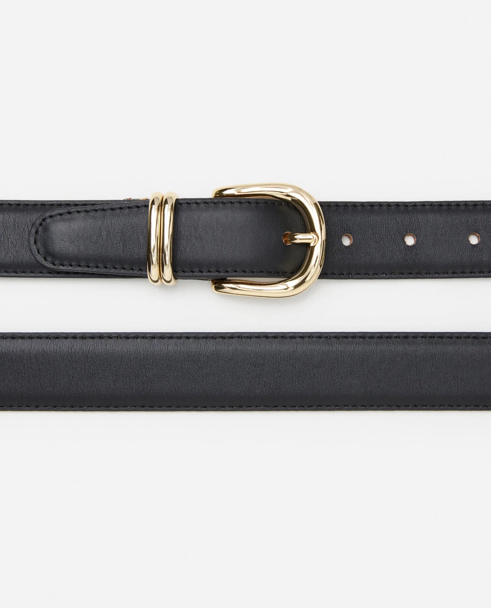 This polished black leather belt offers a timeless, elevated finish to any look. Featuring clean stitching and a curved gold buckle with matching loops, it’s the perfect accessory for adding refined structure to denim, trousers, or dresses.