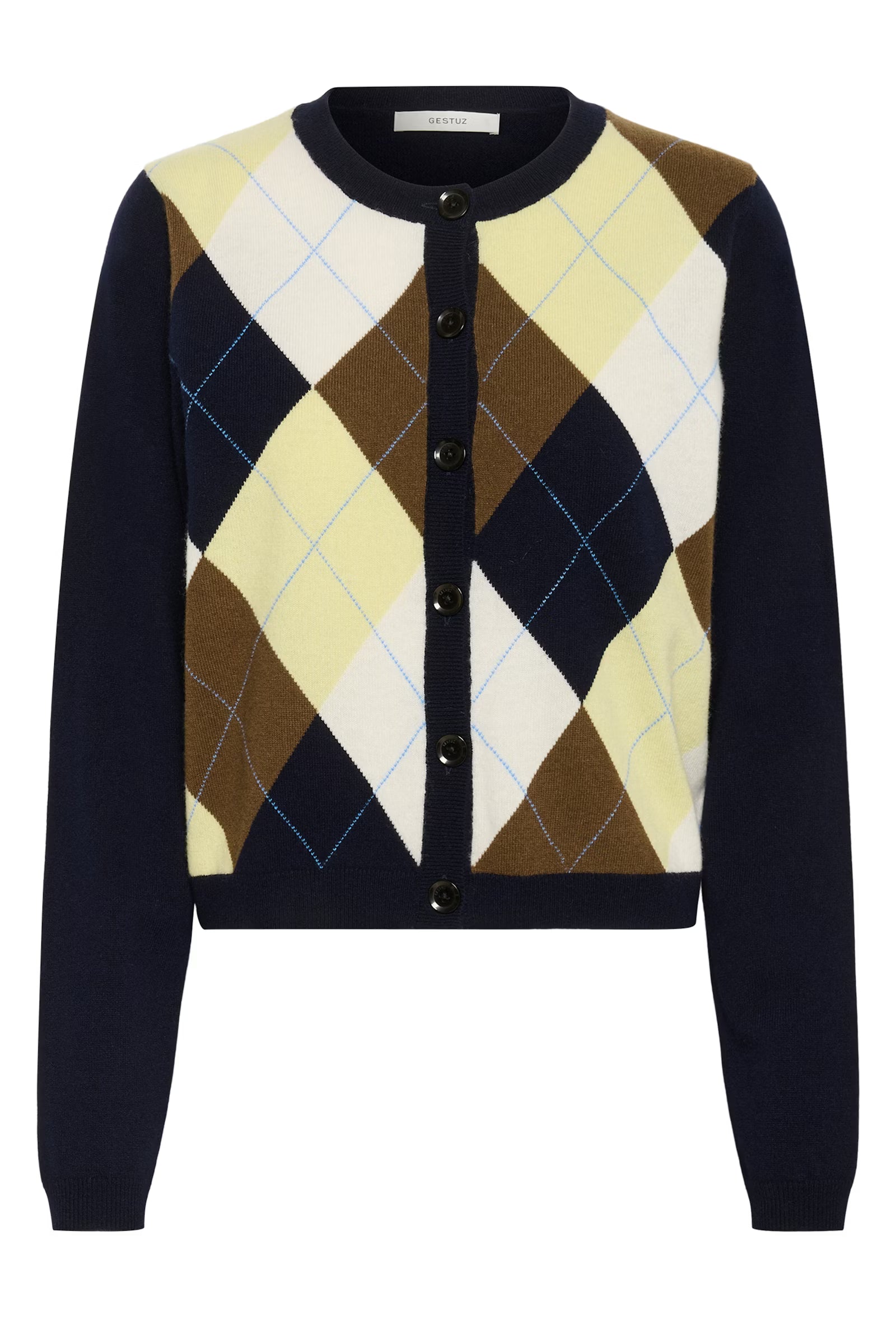 Argyle cardigan with a straight fit, button front, and soft texture. Features long sleeves, classic crew neckline, and cropped length for a modern edge.