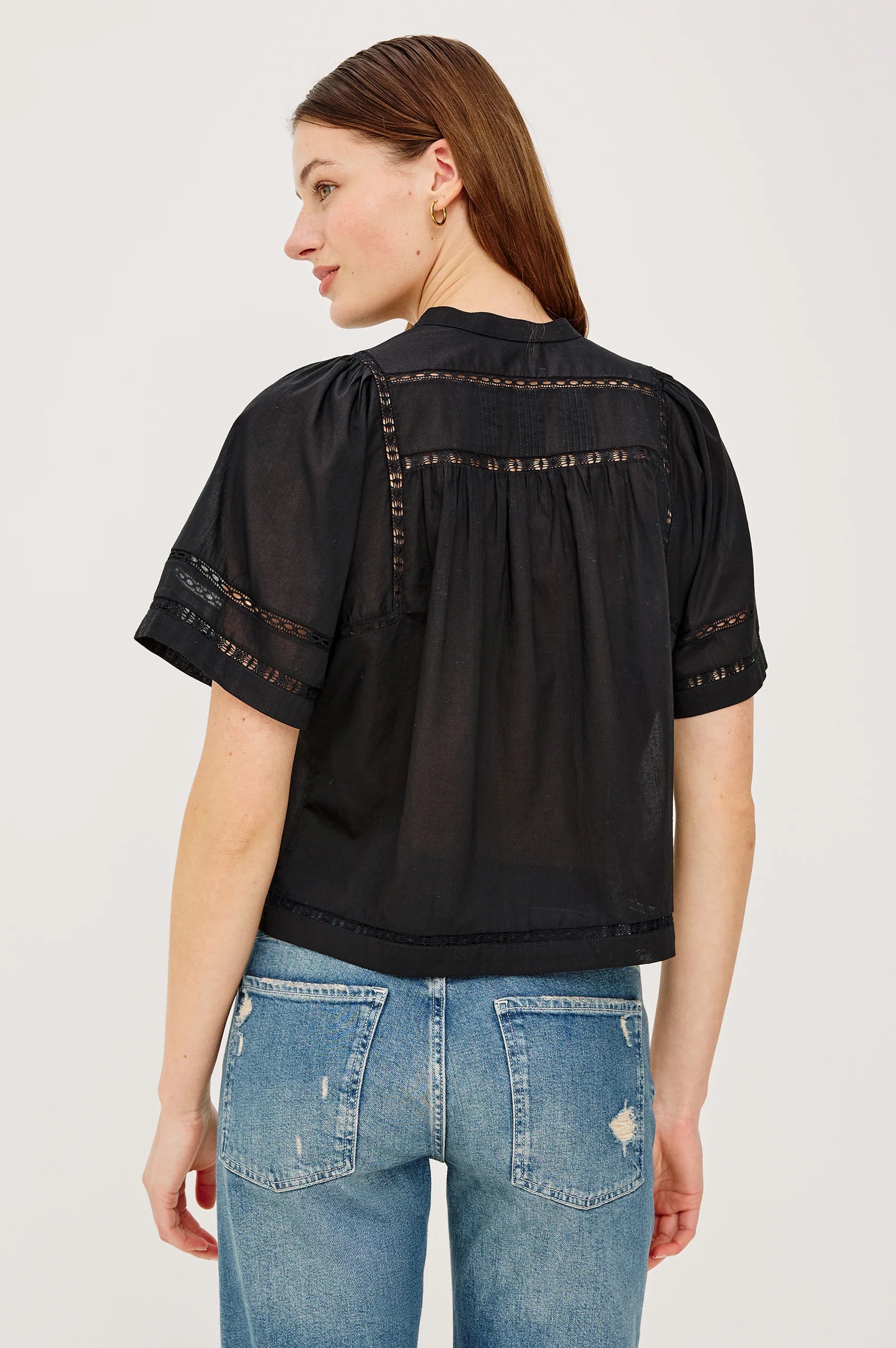 A feminine everyday blouse with delicate detailing that feels special but still easy. The embroidery and soft puff sleeves give it a subtle romantic touch.